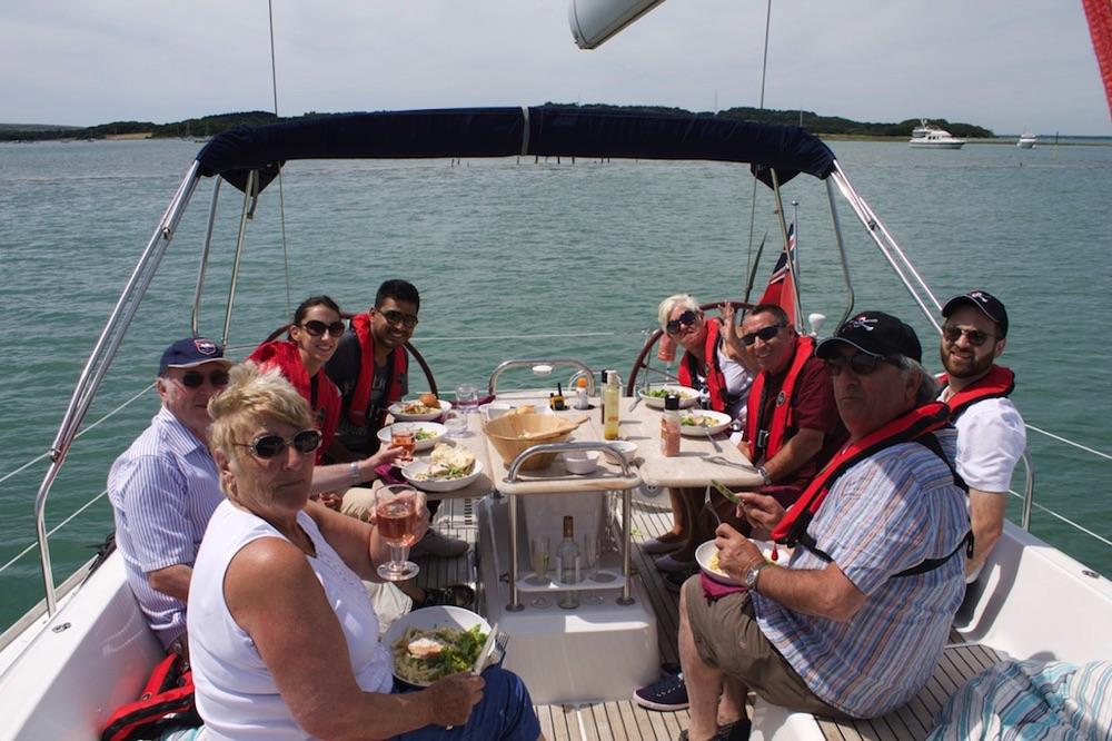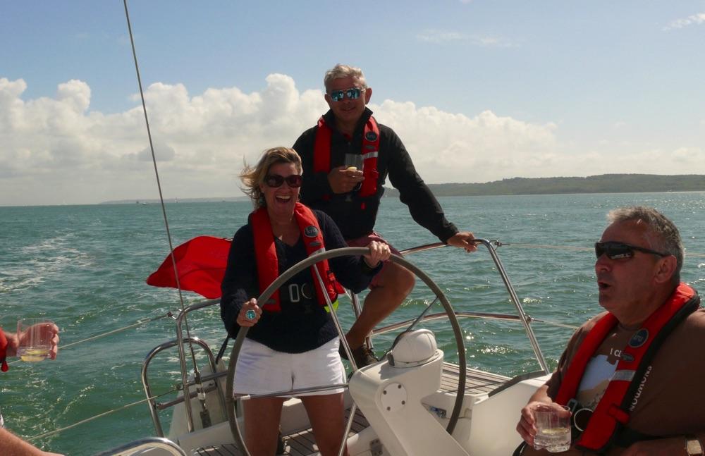 Enjoy a glass of Champagne as you set sail on your beautiful, large, comfortable and modern yacht. After a few hours of sailing on the Solent you anchor off the Isle of Wight for a delicious freshly prepared two-course meal, served on deck, and the opportunity for a swim! Afterwards there is more sailing as you head back to Lymington – getting involved as much as you wish – or just sitting back and relaxing! This is a great day out on your own, as a couple, or with a group of friends and family, clients and colleagues. You will have a price yacht for your group which can be up to 10 guests maximum. What better way is there to celebrate a special occasion with a difference?